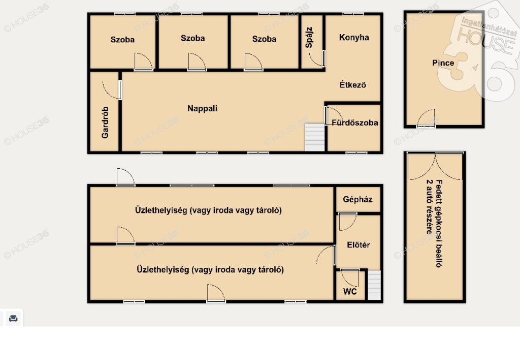 - földszinten 2 kialakított üzlethelyiség, amely alkalmas lakhatásra is (124 m2)