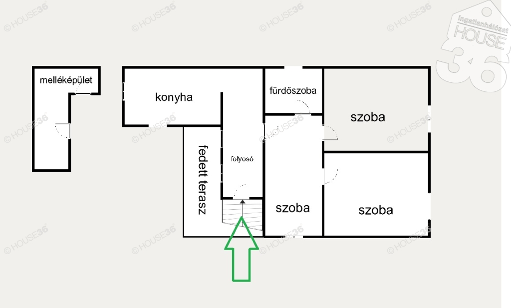 Fedett terasszal, pincével és melléképülettel.