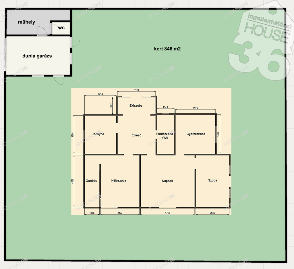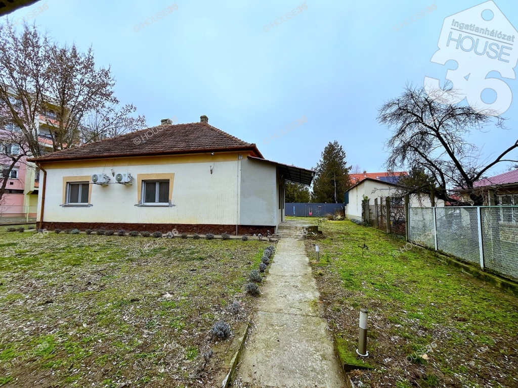 A csendes utcában található ingatlan egy 846 m2-es telek közepén fekszik. Körben üde zöld pázsit veszi körül.