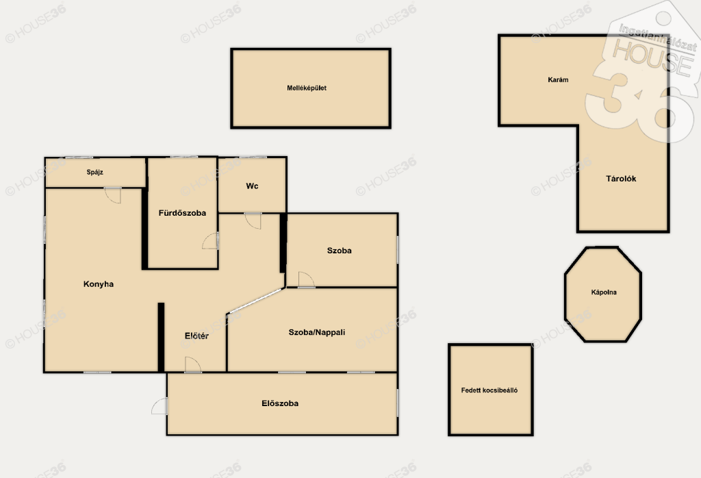 Az ingatlanhoz három melléképület tartozik, amelyek kápolna, garázs és tároló, valamint istálló funkciót látnak el további 120 m² méretben.