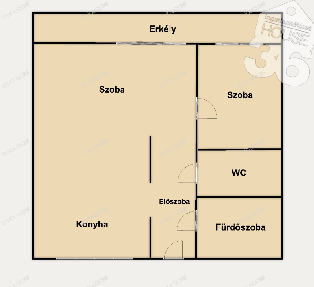 A lakás elosztása praktikus: nappali és hálószoba, konyha, előszoba, fürdőszoba és külön WC található benne.