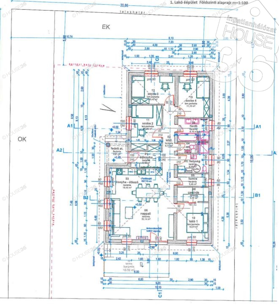 szoba1(10,31 m2), szoba2 (10,09 m2), szoba3 (10,42 m2), szoba4 (11,19 m2)