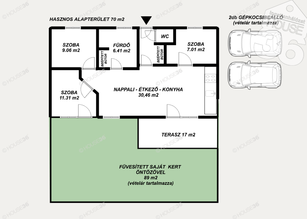 - Parkosított (füvesített) saját udvar automata öntözővel
