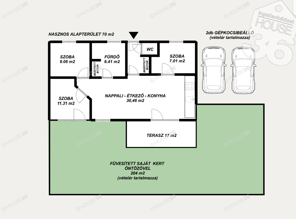 - Parkosított (füvesített) saját udvar automata öntözővel