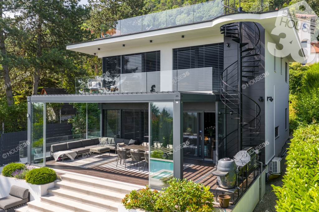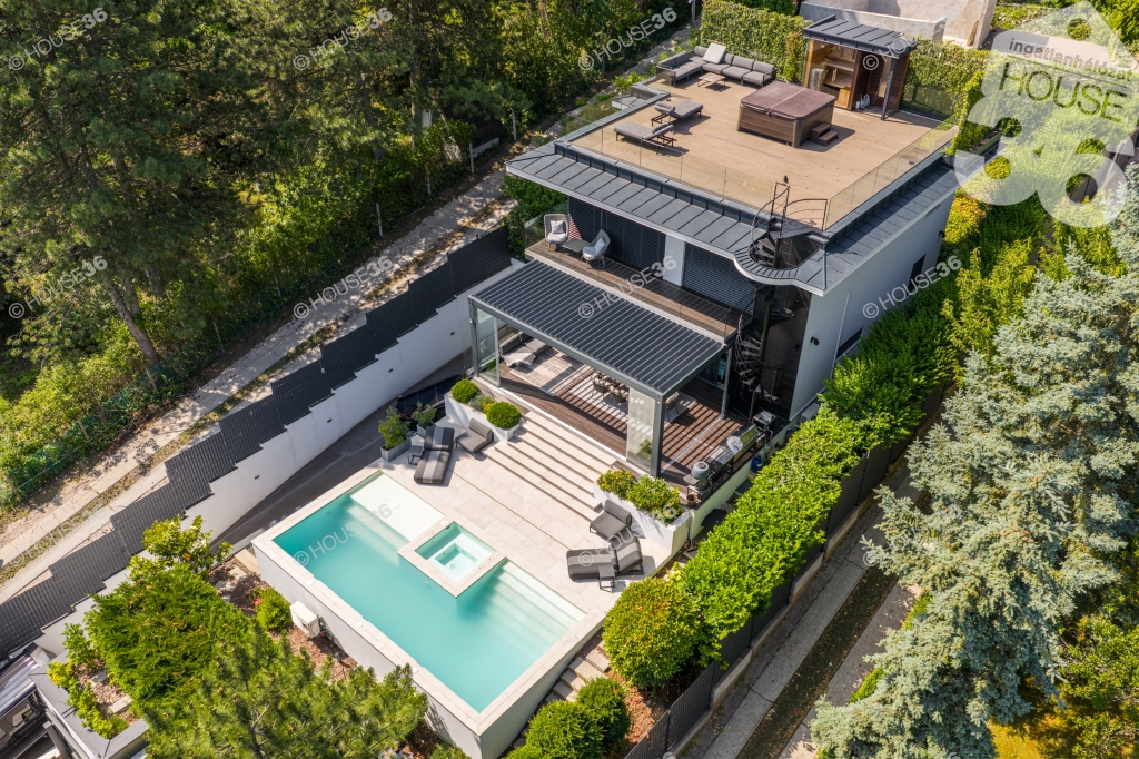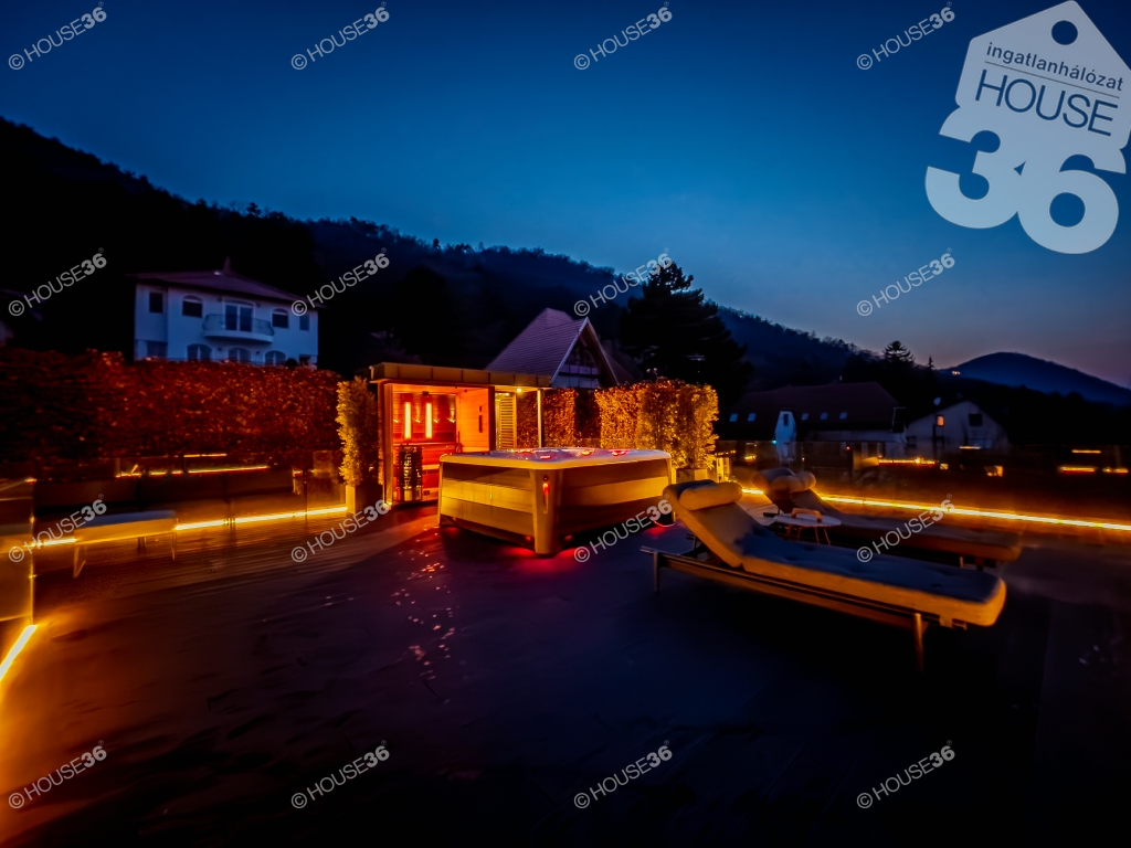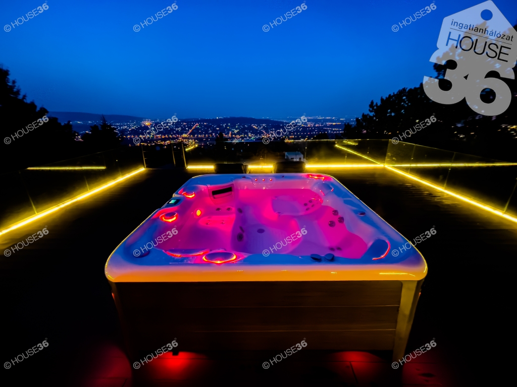 - teraszok összesen 200 m2 ebből a panoráma tetőterasz 100 m2, amerikai hot-spring jacuzzival és - egy panoráma infra és finn szaunával,