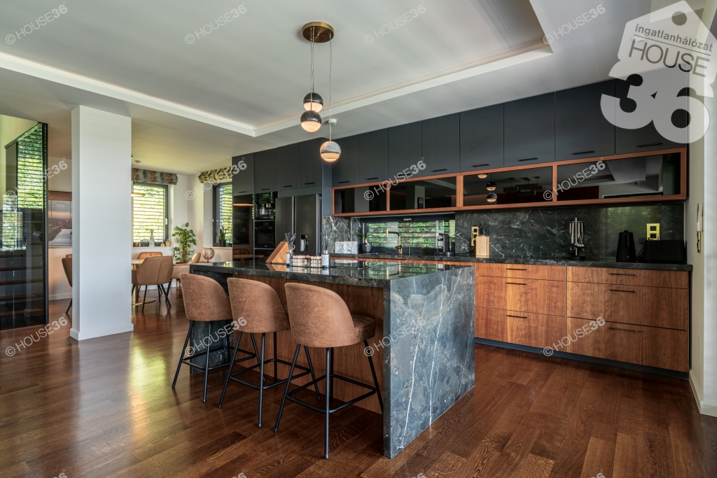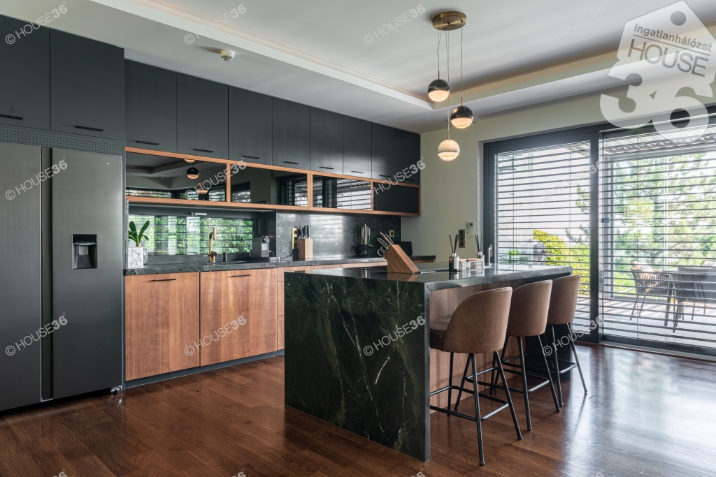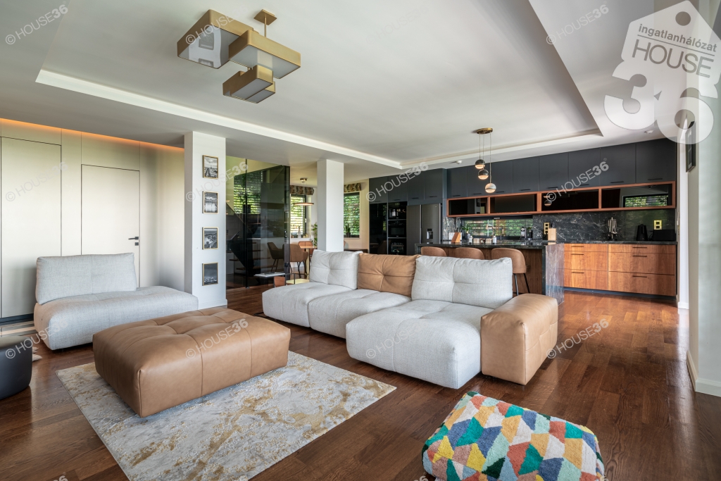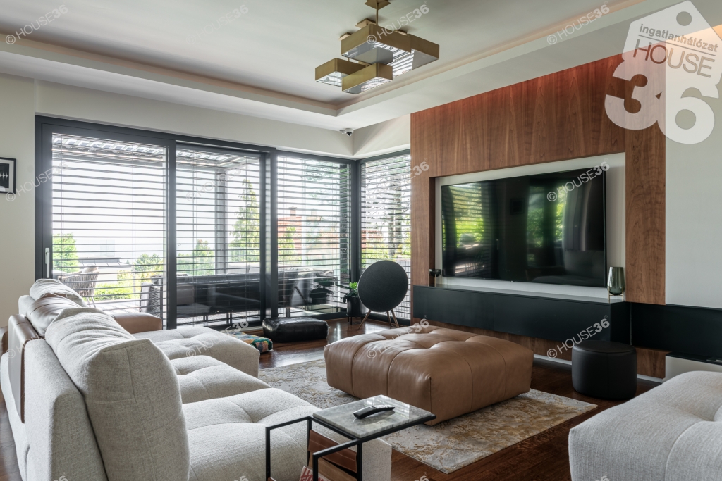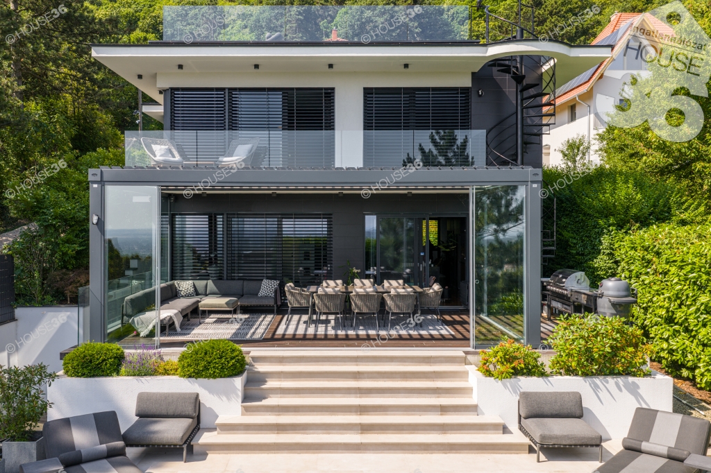 - teraszok összesen 200 m2 ebből a panoráma tetőterasz 100 m2, amerikai hot-spring jacuzzival és - egy panoráma infra és finn szaunával,