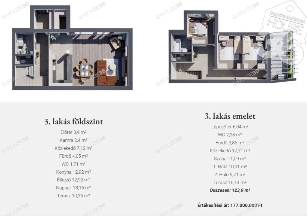3-as lakás, 2 szintes, 123,9 m2 + 2 terasz, 16,14 és egy 10,35m2-es. Nappali + 3 szoba, dupla fürdő.