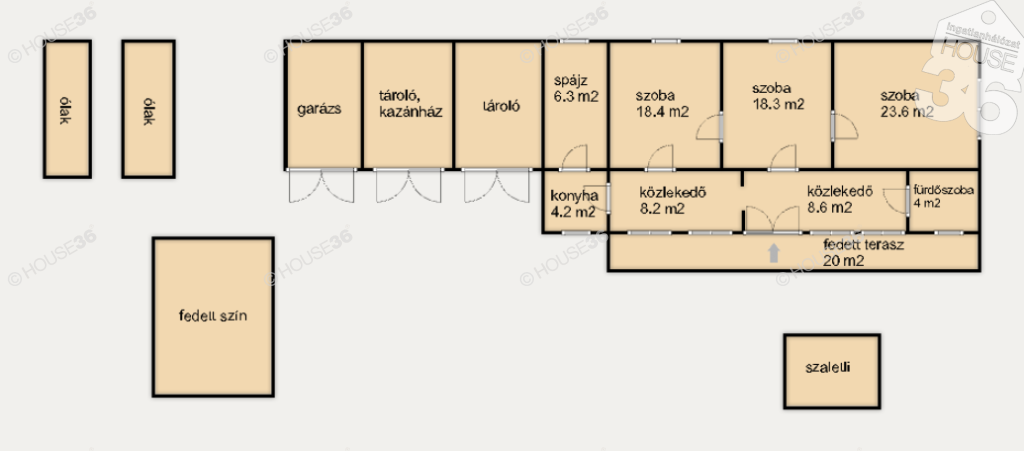 Az ingatlan részét képezi továbbá: garázs, szaletli, több tároló, fedett szín, valamint állattartásra alkalmas ólak is. Iskola, bolt, óvoda, posta, gyógyszertár: 500-1000 méteren belül elérhető. Kevés ráfordítással jó választás lehet, akár 1-2 gyermekes családok, vagy a nyugdíjas korosztály számára.