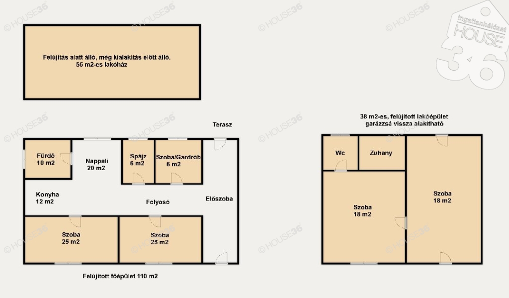 -Lakható épület: 38 m2 (teljeskörűen felújítva, fürdővel, de vissza alakítható garázzsá)