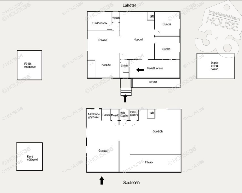 - Szuterén: nagy fűtött garázs, zuhanyzó, mosdó, infra kabin, gépészet (medence ill. lakóház), óriási tároló helyiség (jelenleg gardrób szoba) - lakrész kialakítható