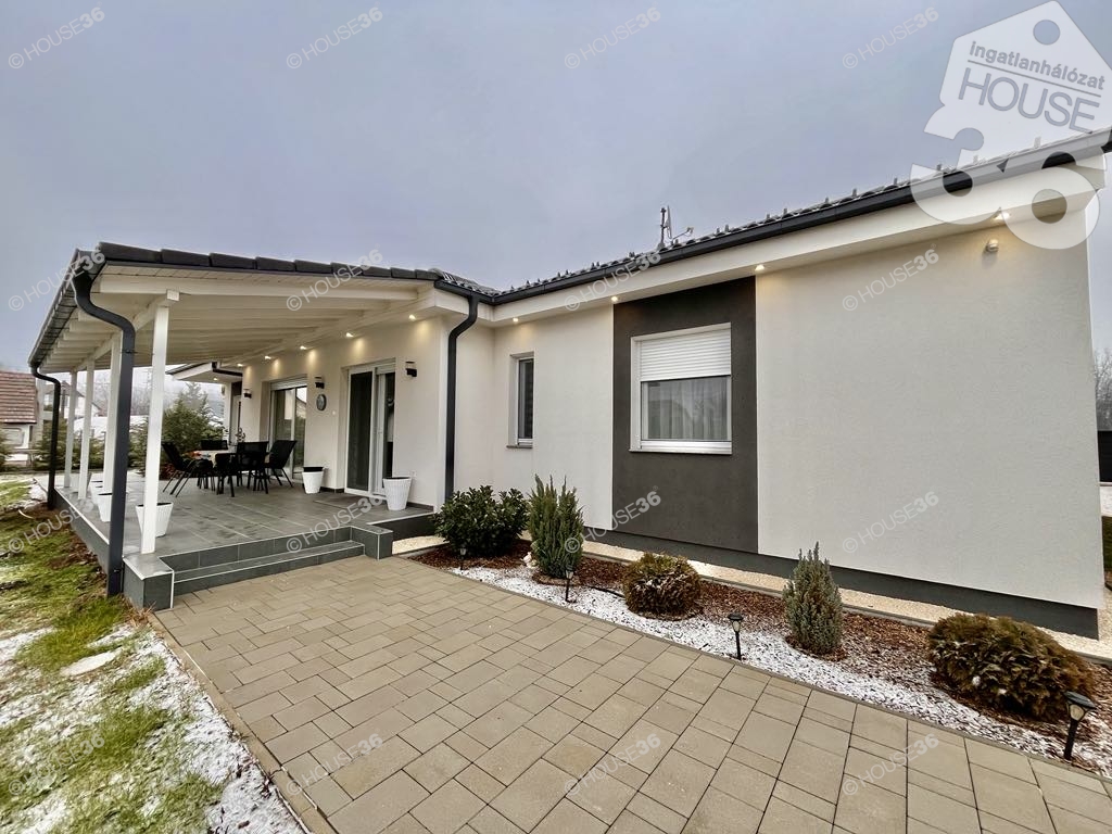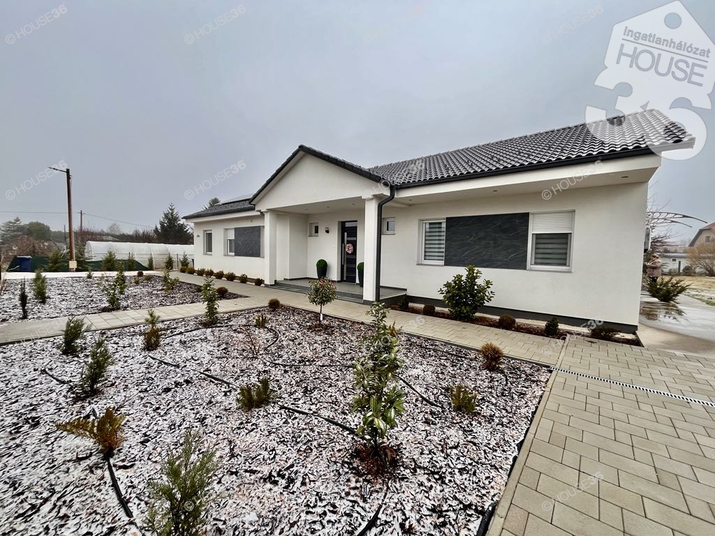 kiemelkedő műszaki tartalommal rendelkező családi házat. Az ingatlan 120 m2 lakóterű, nappali + 4 szobás + gardróbszobás, 2 fürdőszobával, 32 m2-es két terasszal és egy 1500 m2-es, parkosított telekkel.