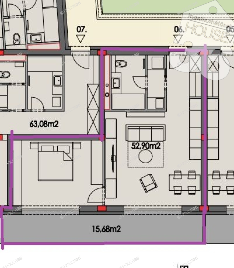 épület első emeletén, 52,9 m2 lakóterű, nappali + 1 szobás lakás, 15,68 m2 erkéllyel megvásárolható.