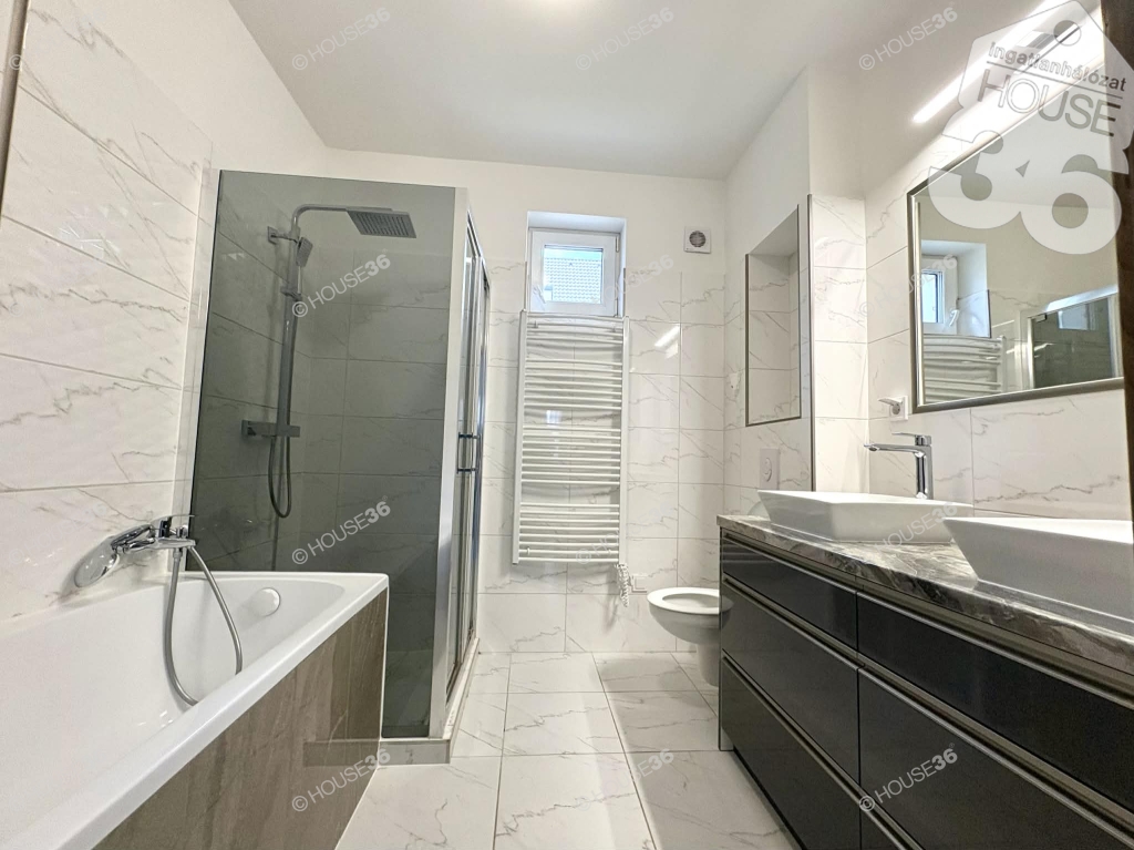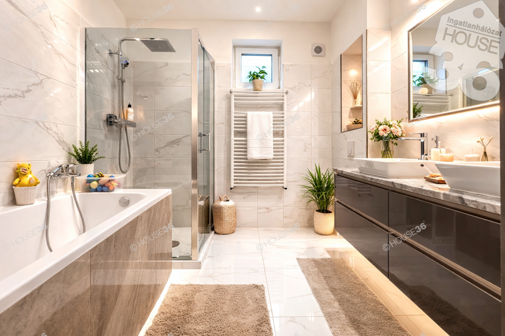 Igényes fürdőszoba káddal, zuhanyzóval és dupla mosdóval