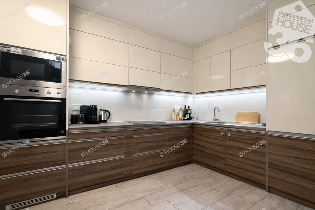 Beépített, gépesített konyhabútor prémium minőségben. Elektromos redőnyök, szúnyoghálós nyílászárók.