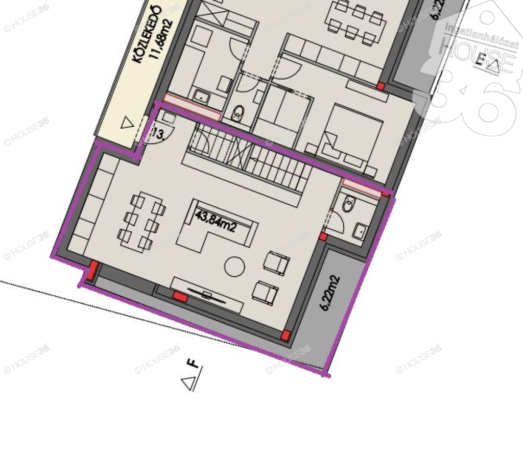 első emeletén, lakáson belül kétszintes, bruttó 97,16 m2, nettó 88,24 m2 lakóterű, nappali + 2 szobás lakás, 12,44 m2 dupla erkéllyel megvásárolható, mely külön lépcsőházból elérhető ahol nincs lift.