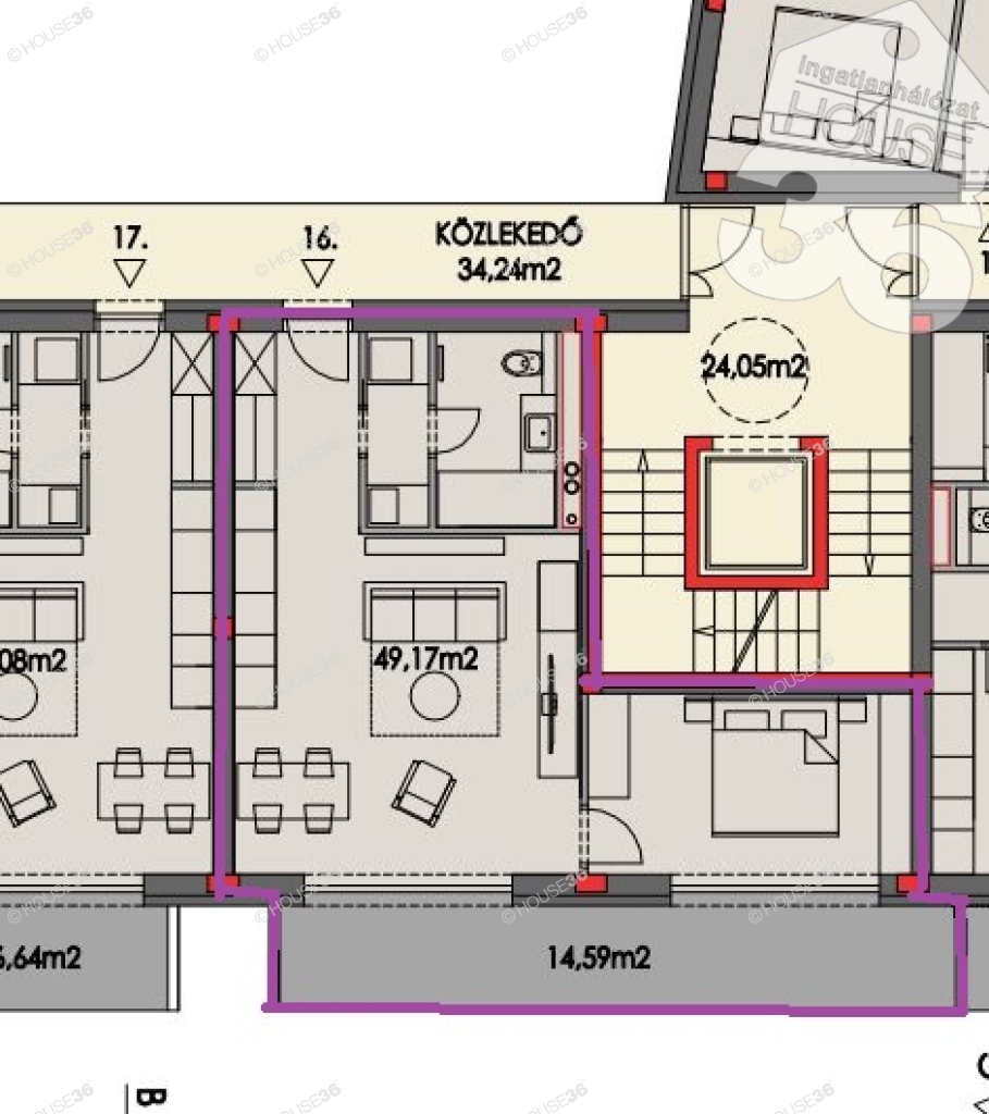 épület II. emeletén, 49,17 m2 lakóterű, nappali + 1 szobás lakás, 14,59 m2 erkéllyel megvásárolható.