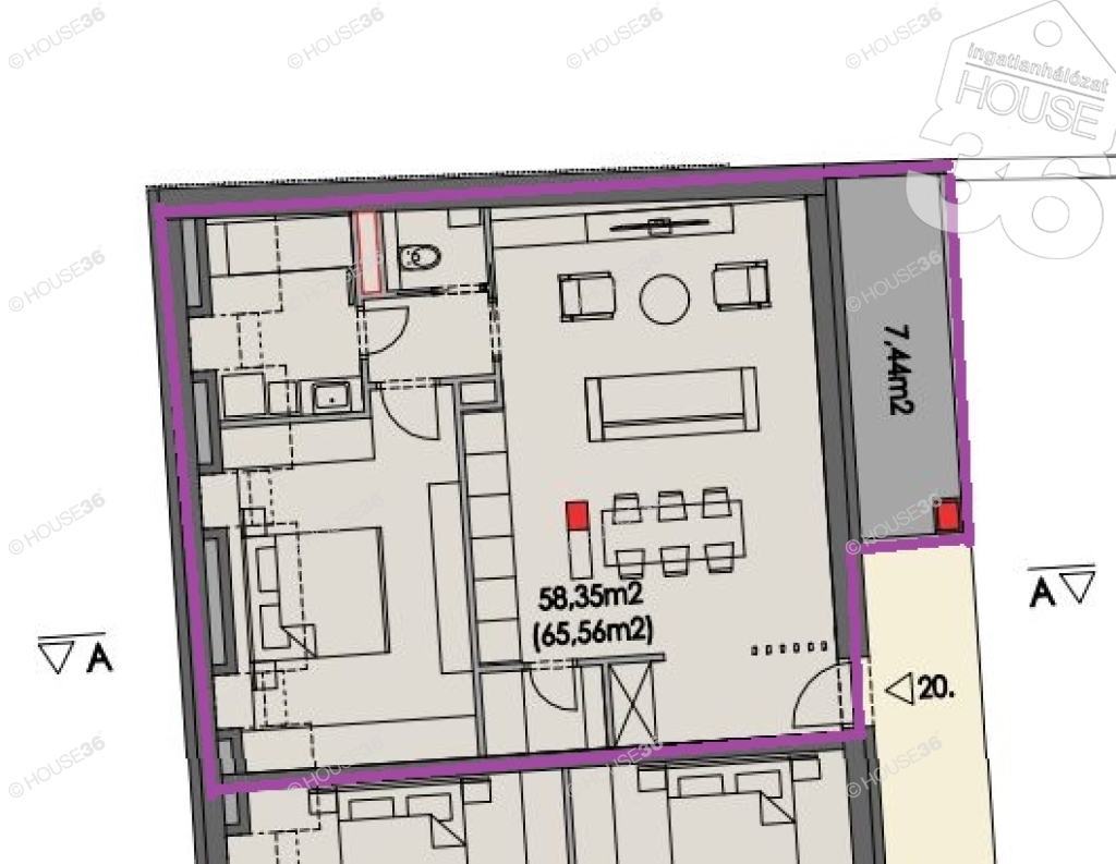 épület II. emeletén, bruttó 65,56 m2, nettó 58,35 m2 lakóterű, nappali + 1 szobás lakás, 7,44 m2 erkéllyel megvásárolható.