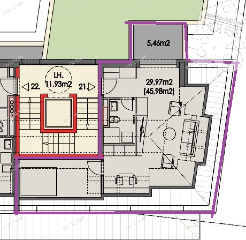 épület III. emeletén, bruttó 45,98 m2, nettó 29,97 m2 lakóterű, nappali + 1 szobás lakás, 5,46 m2 erkéllyel megvásárolható.