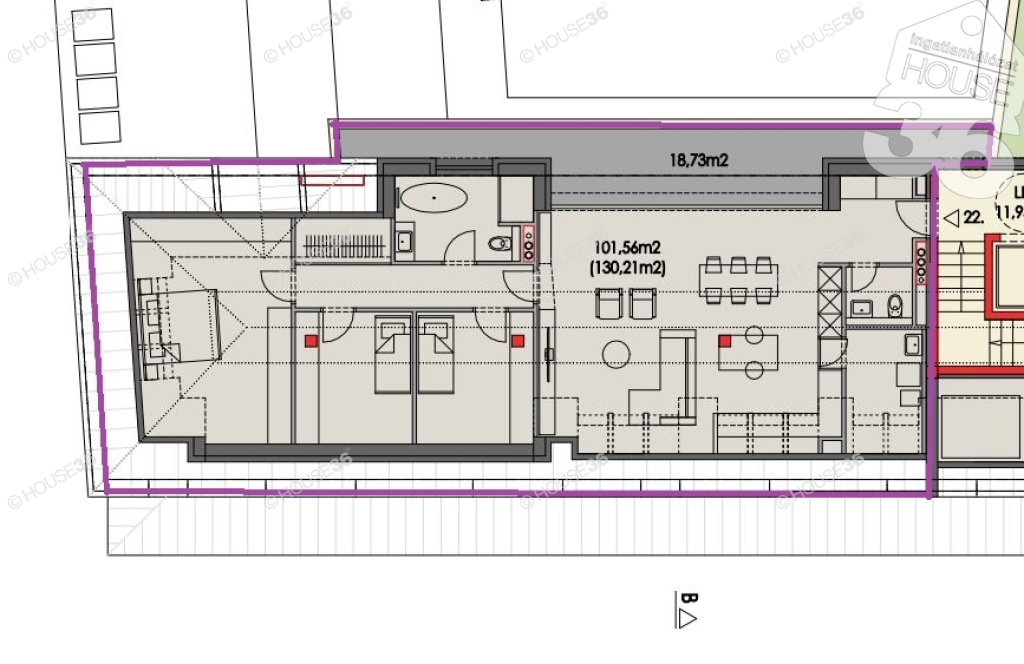 épület III. emeletén, bruttó 130,21 m2, nettó 101,56 m2 lakóterű, nappali + 3 szobás lakás, 18,73 m2 erkéllyel megvásárolható.