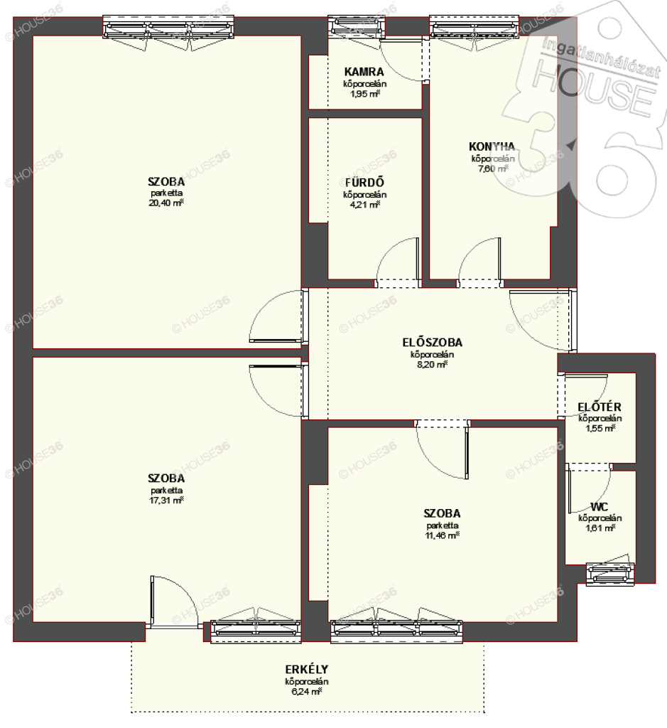 A lakás praktikus elrendezésű: három külön nyíló szoba, közlekedő, fürdőszoba és konyha helyiség alkotja.