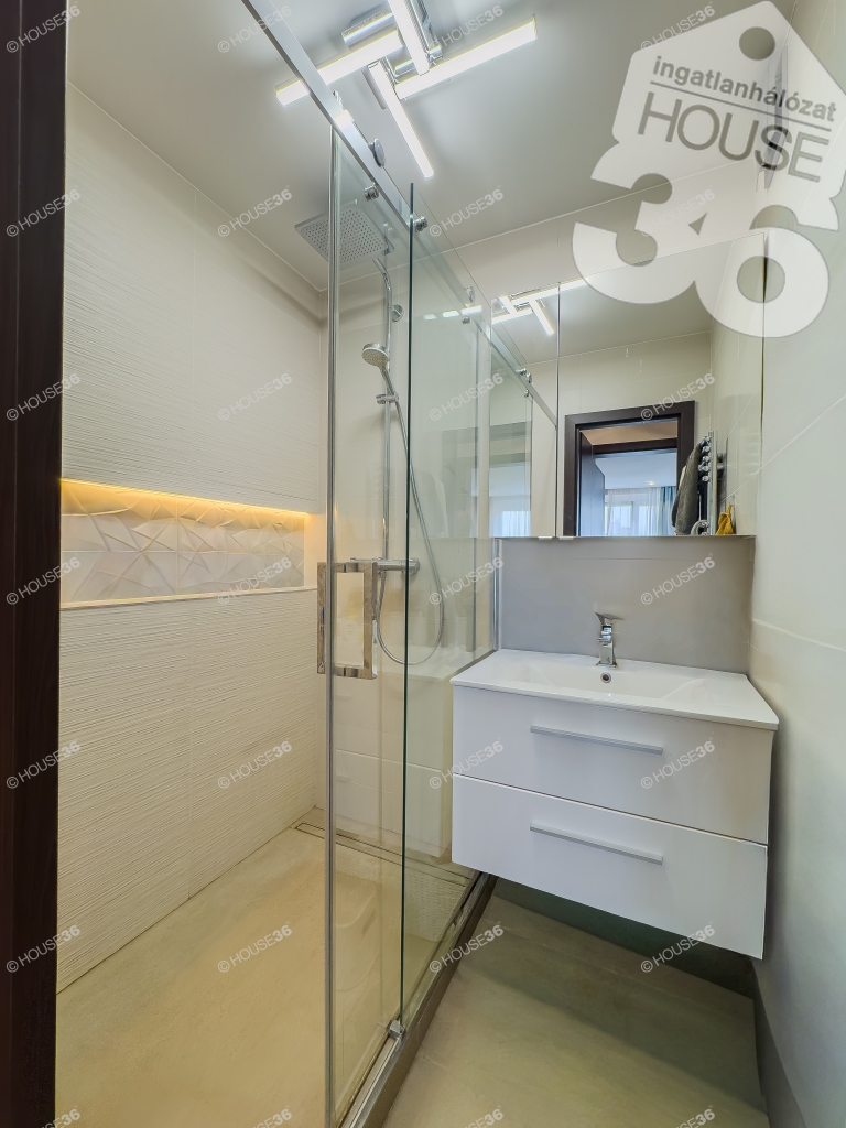 - Tágas, igényesen kialakított zuhanyzós fürdőszóba, Hansgrohe csapteleppel.