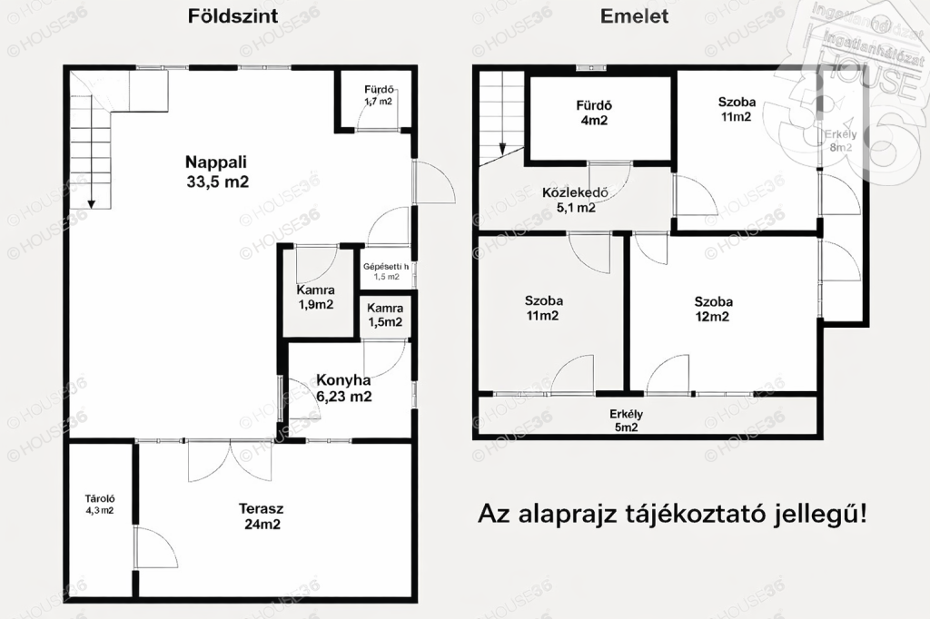 Elrendezés: A földszinten (50 m2) tágas nappali, konyha-étkező, kamra és vizesblokk; az emeleten (40 m2) 3 külön nyíló szoba, fürdő és erkélyek kaptak helyet.