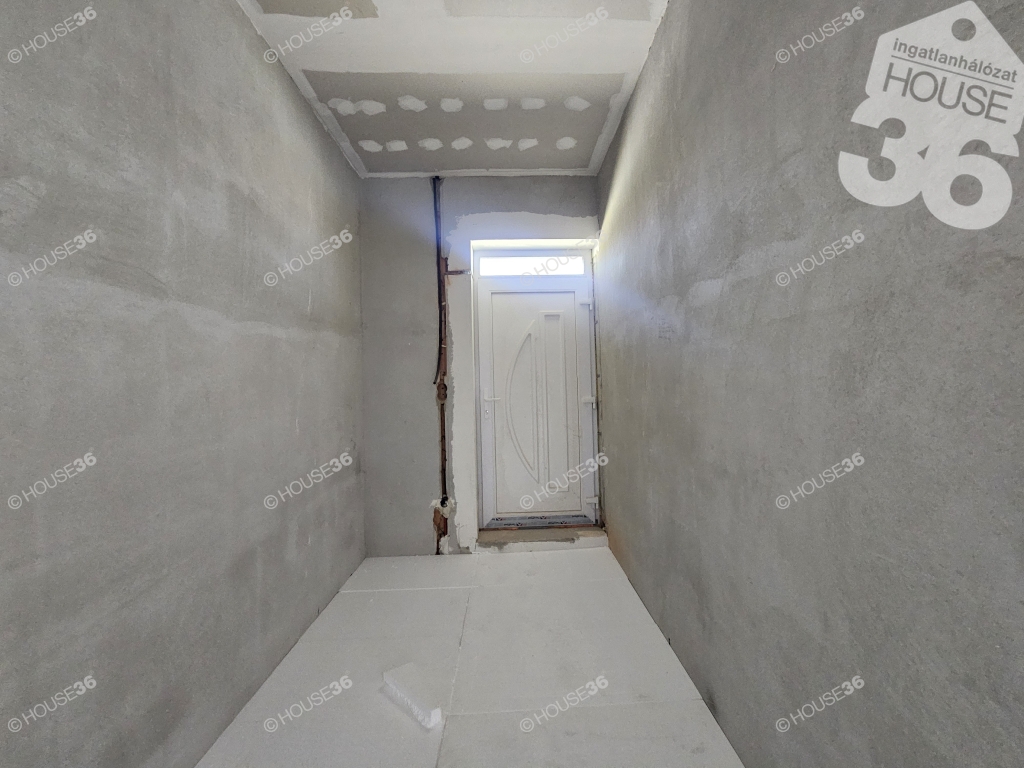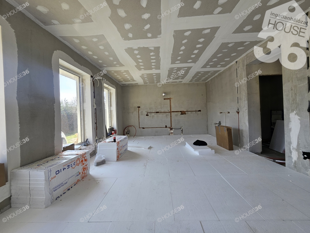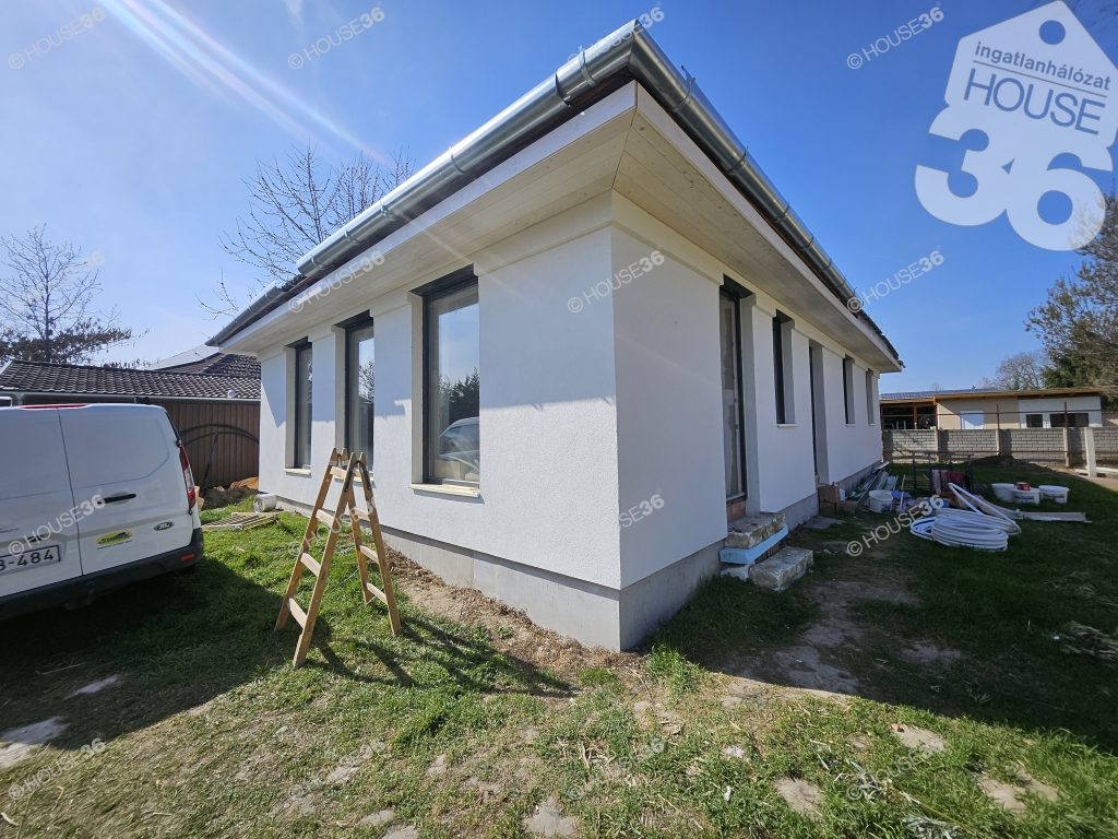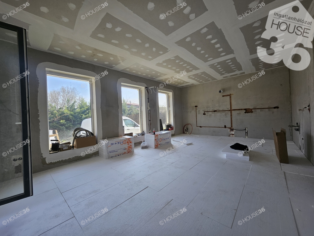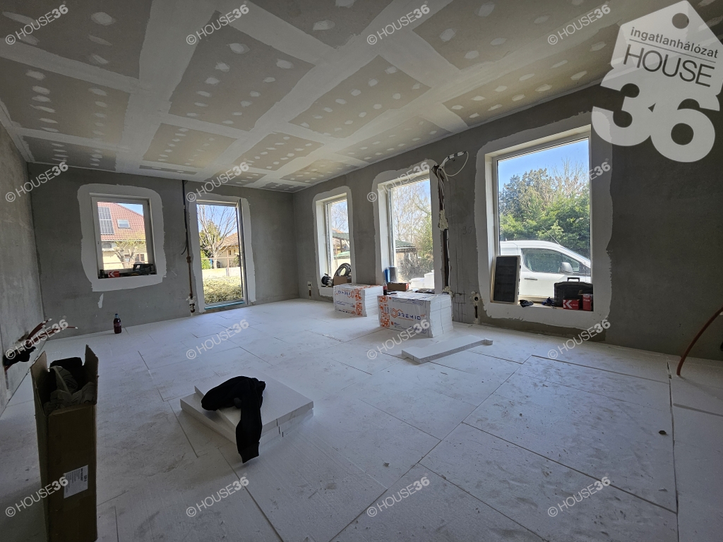 Kecskeméten, a Hunyadiváros újépítésű részén, aszfaltozott utcában, hátsó, nyeles, osztott telken (használati megosztással), 519 m2-es, teljesen körbekerített telken, 95,69 m2-es, nappali + 3 szobás családi ház, 2026 nyári átadással eladó! Jelenleg a ház már tető alatt áll, gépészeti-és burkolási munkák folynak.